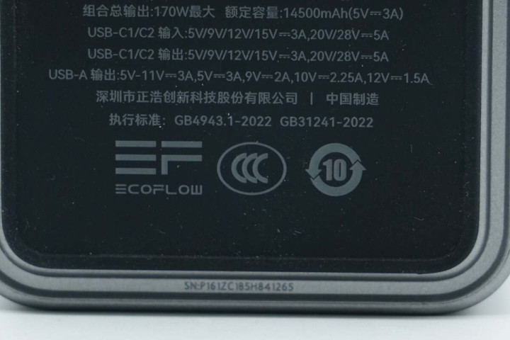 另一侧配置USB-C2双向快充接口,接口右侧壳体上印有170W、25000mAh/90Wh以及可携带上飞机标识。