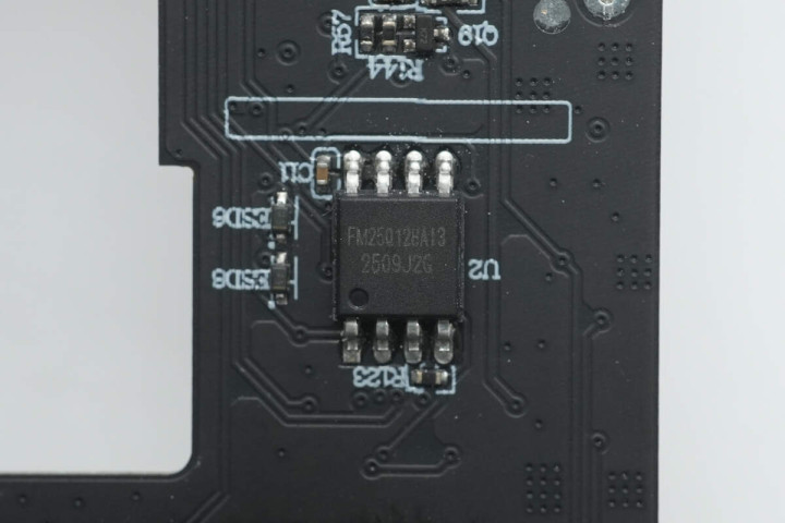 外置存储器来自复旦微,型号FM25Q128AI3,这是一款16MB串行闪存芯片,具有宽电压工作范围。芯片支持标准串行外设接口(SPI)、双线/四线I/O以及双时钟指令周期的四线外设接口(QPI),采用SOP8封装。